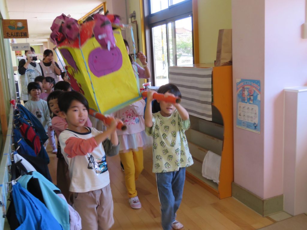 年長児が収穫祭に向けてお神輿をつくりました。