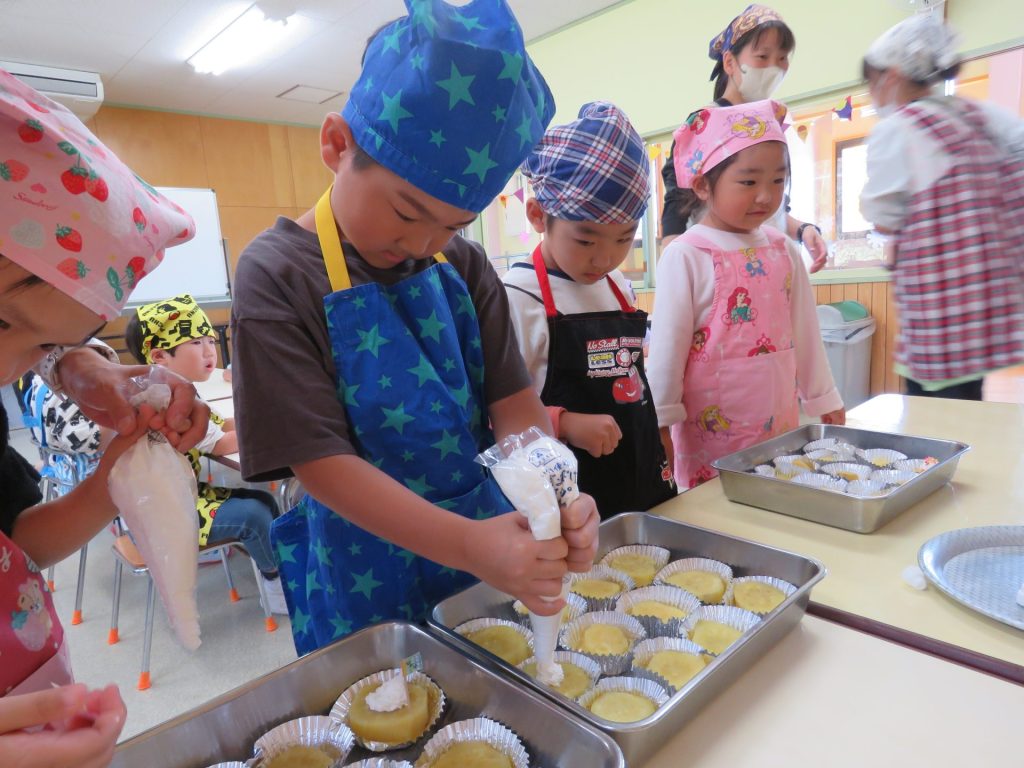 クリームを絞り、カラースプレーをかけて、さつま芋のケーキを真剣に作り、クッキングの楽しさを感じる子ども達でした♪