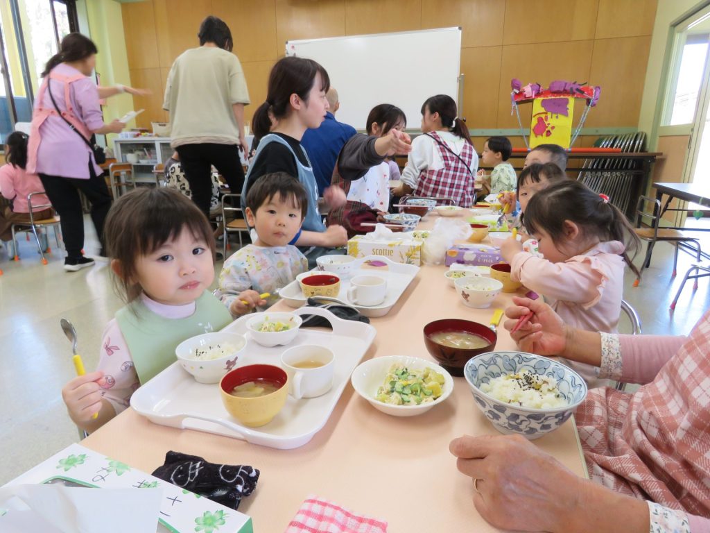 今日は、いつもお部屋で給食を食べている未満児も一緒にランチルームで食べ、さつま芋を味わって楽しんでいる様子が見られました。