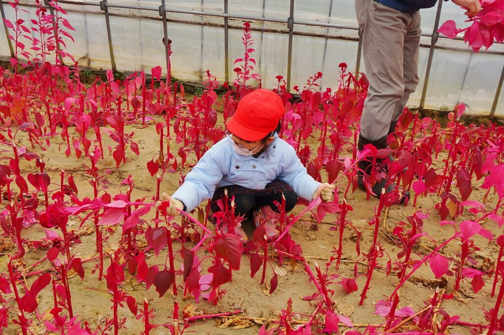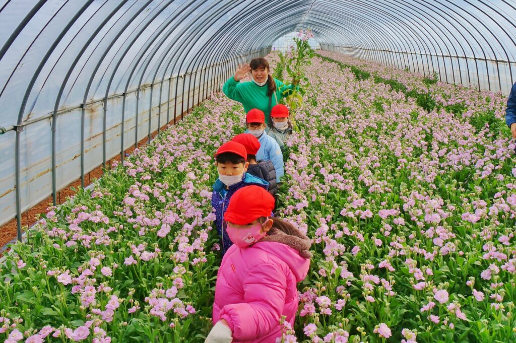 酒田の文化を知る機会の一つとして収穫体験をさせていただきました。子ども達は「ストック」という花の名前を聞くのも初めての子もいて、「どんな花かな?」「何色かな?」とワクワクする姿が見られました。