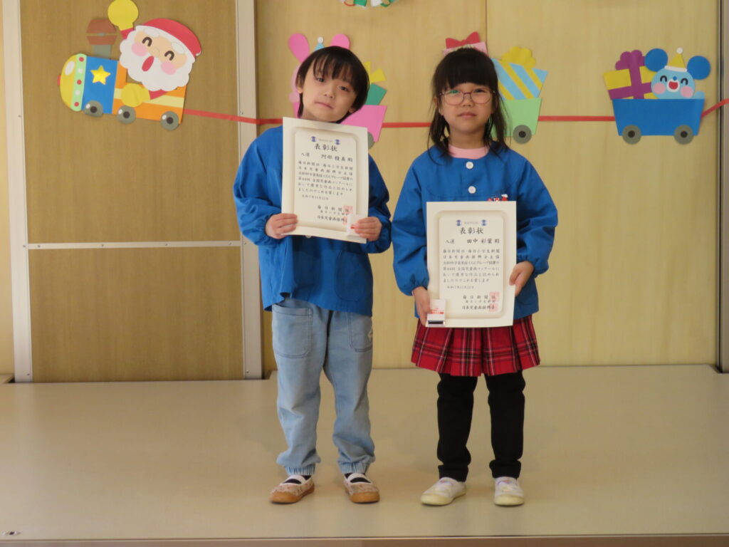 終業式後には、CGCイラストコンクールに出品し、「夏の思い出」を描いて入賞した5歳児2名の表彰も行いました