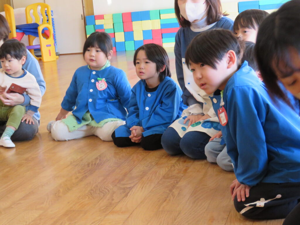 「今年が終わる前に言う言葉は?」「ことしもおせわになりました!」、「年を越したら言う言葉は?」「あけましておめでとうございます。ことしもよろしくお願いします。」と、みんなで季節の言葉にもふれました。